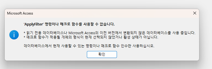 읽기전용 데이터베이스나 마이크로소프트이전버전에서 변환되지 않은 데이터 베이스를