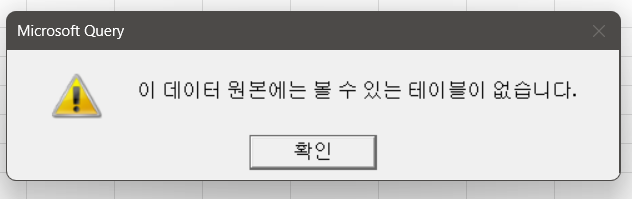 156페이지 1-3번에서 확인을 클릭하면 "이 원본 데이터에는 볼 수 있는 테이블이 없습니다"고 에러 메시지가 나옵니다. 데이터 원본은 '길벗컴활1급01\01 엑셀\제품가공.accdb'입니다. 이 사이트에서 다운로드 받은 후 아무런 가공도 하지 않았습니다. Microsoft 365의 엑셀을 사용하고 있는데, 이게 원인일까요?
