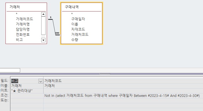 -쿼리 비교 X [관리대상처리] 쿼리 (UPDATE 거래처 INNER JOIN 구매내역 ON 거래처.거래처코드 = 구매내역.거래처코드 SET 거래처.비고 = "★ 관리대상" WHERE (((거래처.거래처코드) Not In (select 거래처코드 from 구매내역 where 구매일자 Between #2023-4-15# And #2023-4-30#))); )이 정답(UPDATE 거래처 SET 거래처.비고 = "★ 관리대상" WHERE (((거래처.거래처코드) Not In (select 거래처코드 from 구매내역 where 구매일자 between #2023-4-15# and #2023-4-30#))); )과 다릅니다.