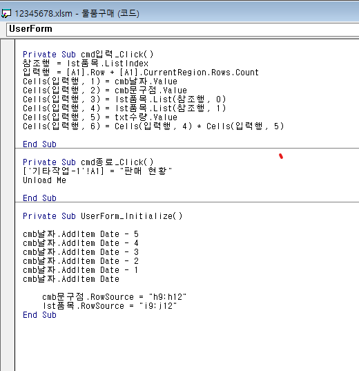 Cells(입력행, 1) = cmb날짜.Value