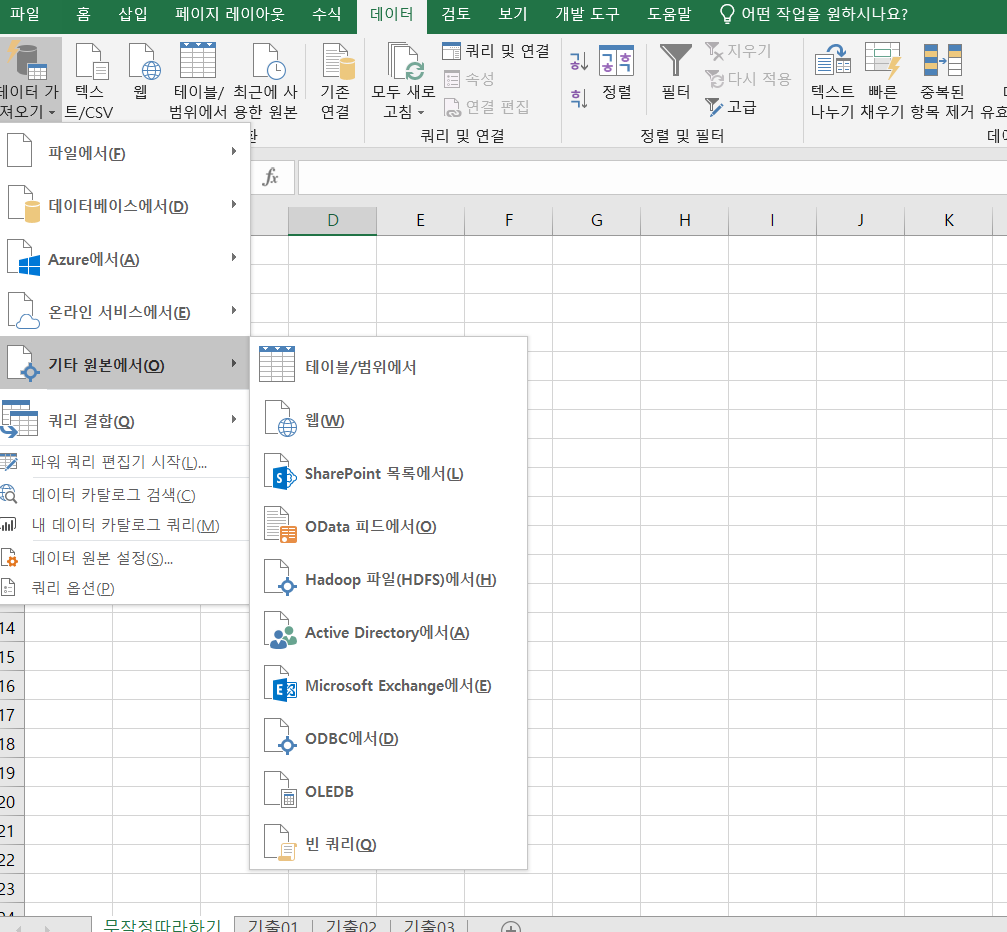 데이터 가져오기->기타원본->마이크로소프트 쿼리에서로 진행 하나요?