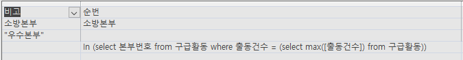 -쿼리 비교 X [우수본부체크] 쿼리 (UPDATE 소방본부 SET 소방본부.비고 = "우수본부" WHERE (((소방본부.순번) In (select 본부번호 from 구급활동 where 출동건수 = (select max([출동건수]) from 구급활동)))); )이 정답(UPDATE 소방본부 INNER JOIN 구급활동 ON 소방본부.순번 = 구급활동.본부번호 SET 소방본부.비고 = "우수본부" WHERE (((구급활동.출동건수) In (select max(출동건수) from 구급활동))); )과 다릅니다.