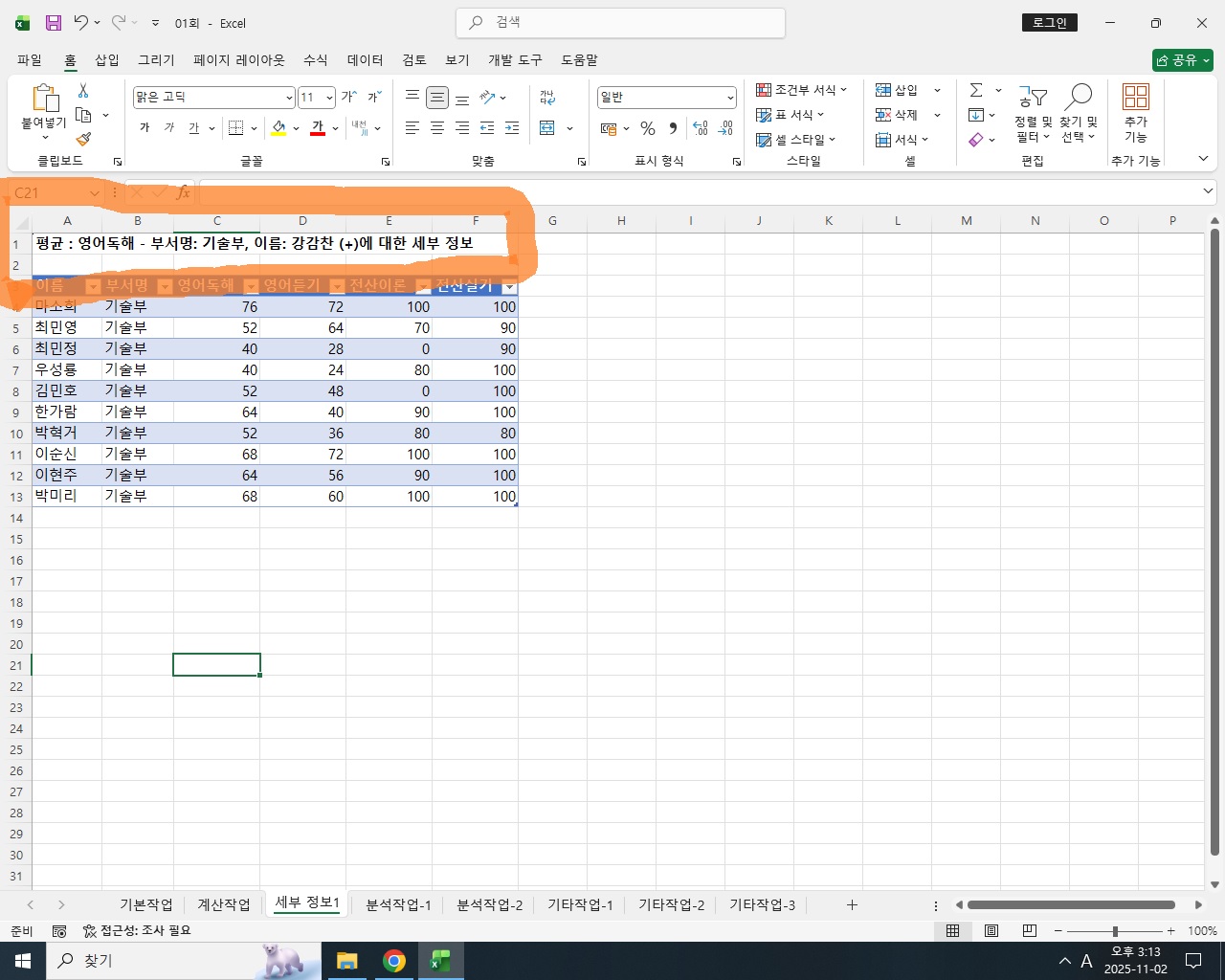 분석작업 1번 작업 후 c5셀에서 클릭하여 기술부 시트를 적용하면 첨부화면처럼