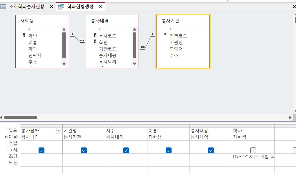 -봉사내역.봉사내용 INTO 조회학과봉사현황 FROM 봉사기관 INNER JOIN (재학생 INNER JOIN 봉사내역 ON 재학생.학번 = 봉사내역.학번) ON 봉사기관.기관코드 = 봉사내역.기관코드 WHERE (((재학생.학과) Like "*" & [조회할 학과명의 일부를 입력] & "*")); )과 다릅니다.