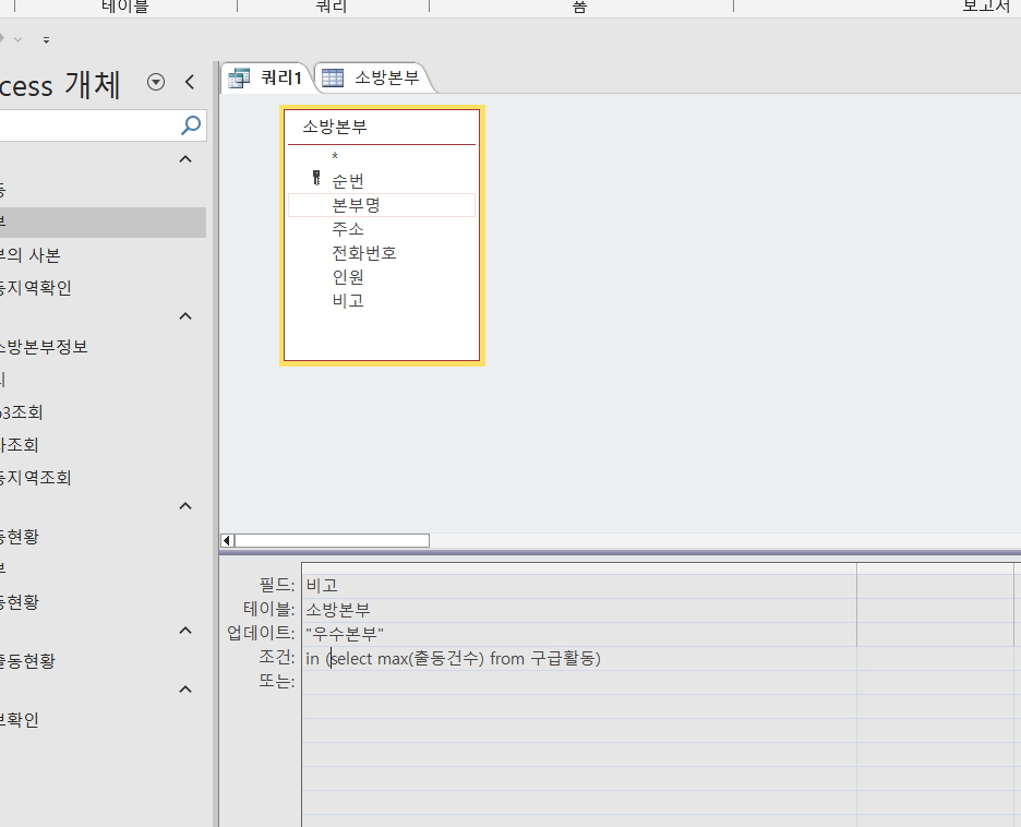 <소방본부>와 <구급활동>은 '순번'과 '본부번호'로 관계가 설정되어 있으므로 <구급활동> 테이블에서 찾은 가장 큰 '출동건수'의 '본부번호' 필드와 연결된 '순번' 필드의 '비고' 필드에 업데이트가 적용되는 원리입니다.