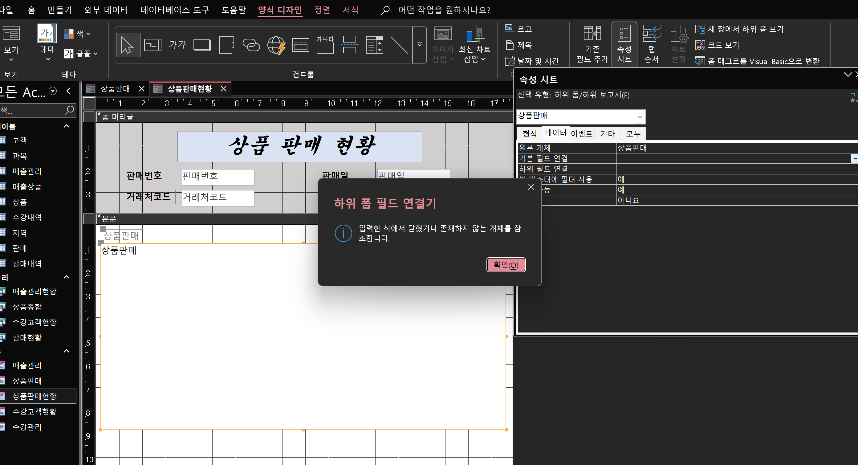 문제1-1-1번 문제인 <상품판매> 폼에 <상품종합> 쿼리를 폼의 레코드 원본으로 설정하는 문제를 풀지 않아서 생긴 오류입니다. 이 문제를 먼저 지정한 후 하위 폼 연결을 풀면 자동으로 기본 필드와 하위 필드가 표시됩니다.
