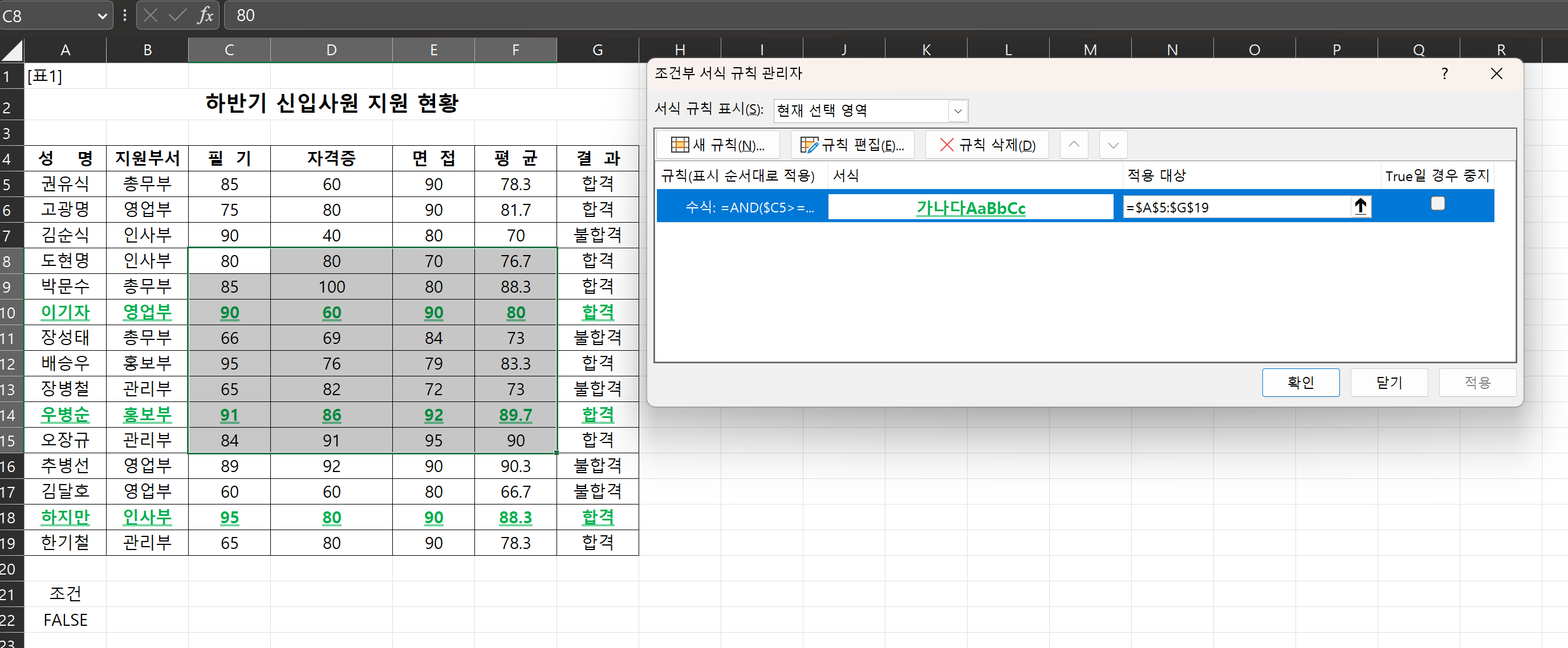정답에 필기랑, 실기 점수에만 조건부 서식이 적용되어 있는데 그게 정답인가요?