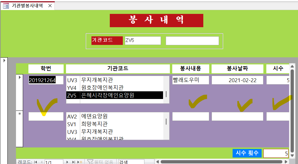 컨트롤 하위 필드 연결 X 폼에 봉사내역가 없습니다.