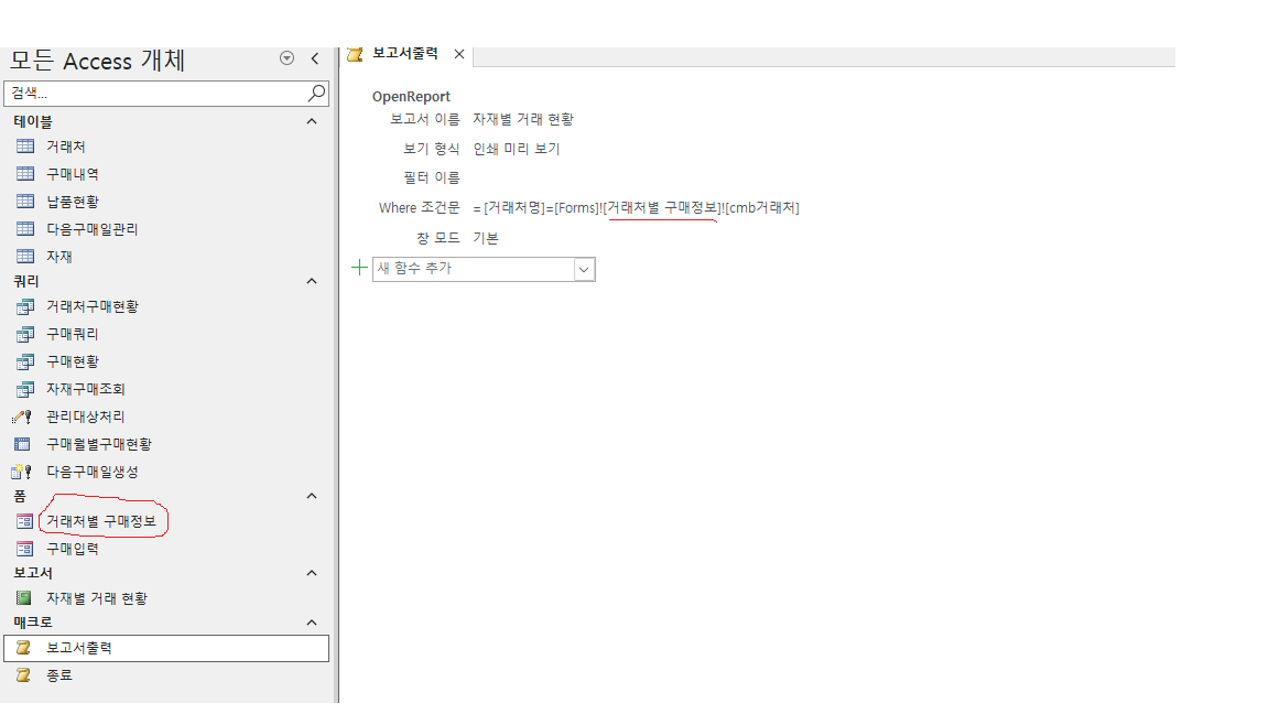 -컨트롤 On Click 속성 X 파일에 거래처별 구매정보 폼이 없습니다.예외가 발생한 HRESULT: 0x800A9C64