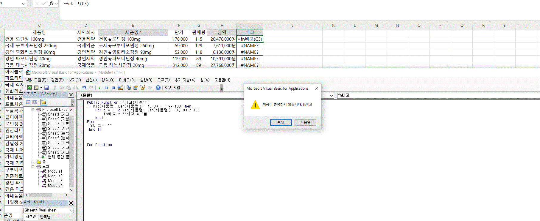 -사용자 정의 함수 코드 X fn비고이 정답과 다릅니다.