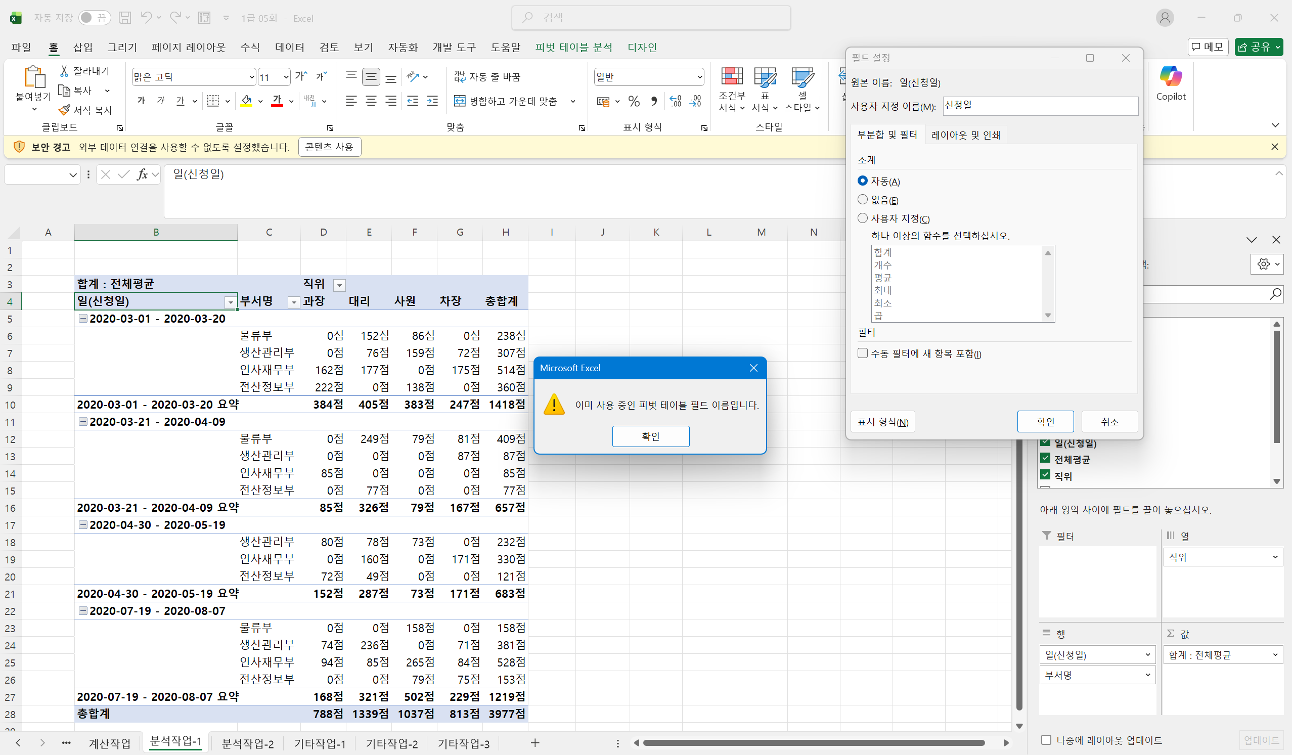 필드 이름을 바꾸려하니 '이미 사용중인 피벗 테이블 필드 이름입니다'라는 경고 메시지가 뜹니다. 이런 경우 이름 수정을 어떻게 해야 하나요?