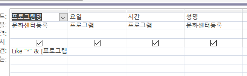 -문화센터등록.성명 INTO 조회프로그램수강현황 FROM 문화센터등록 INNER JOIN 프로그램 ON 문화센터등록.프로그램명 = 프로그램.프로그램명 WHERE (((프로그램.프로그램명) Like "*" & [프로그램명 일부 입력] & "*")); )과 다릅니다.