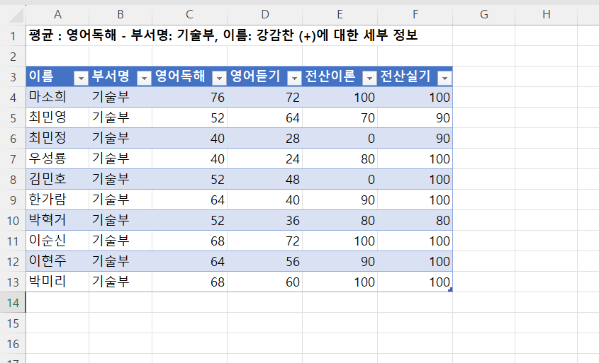 328쪽의 분석작업-1 문제에 대한 문의입니다. 부서명이 기술부인 자료만 별도의 시트에 나타내는 문제인데 별도의 시트에 나타내고 채점을 돌리니 틀리다고 뜹니다. 정답프로그램에서는 영어독해 - 부서명: 기술부, 이름 : 강감찬에 대한 세부 정보가 안나오는데 저는 사진처럼 나오거든요. 실전에서는 저 윗부분을 지워야하나요 아니면 그냥 내버려둬도 상관이 없을까요?