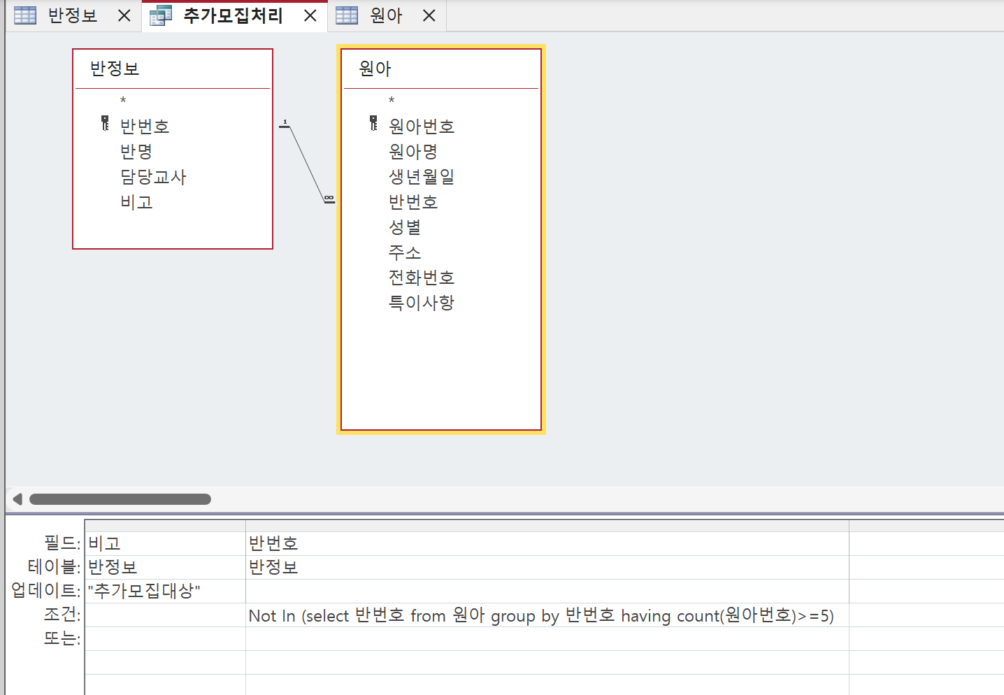 (select 반번호 from 원아 group by 반번호 having count(원아번호)>=5) 이렇게 하면 나오는 것은 c1,c2,c3입니다.