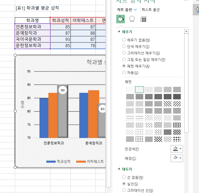 -차트 영역 테두리 X 차트 영역의 패턴 채우기 값 (msoPattern10Percent)이 정답(msoPatternMixed)과 다릅니다.