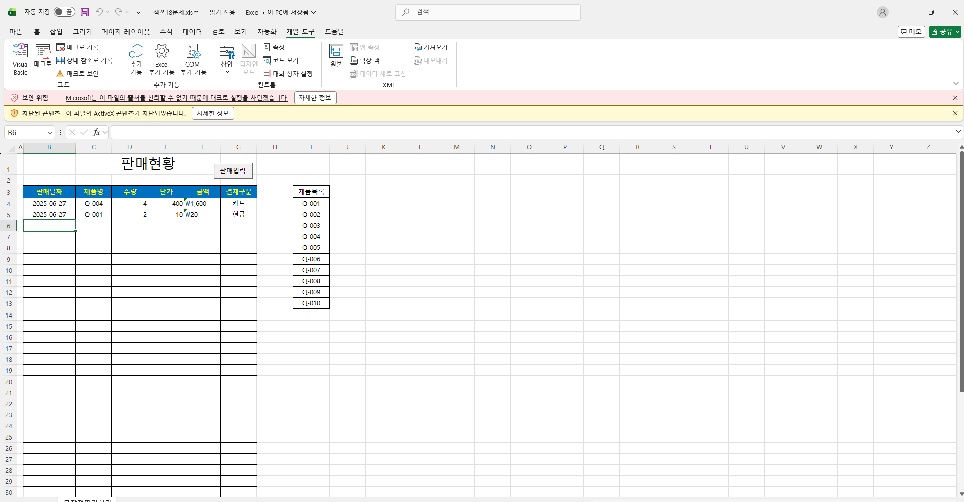 243p 프로시저 작성 부분 연습하기 위해 엑셀 파일을 열면 다음과 같이 개발도구 탭에서 디자인 보기 가 비활성화 되어있습니다. 또한 보안 문제때문에 ACTIVE X, 매크로가 차단되었다고 나오는데 어떻게 해결해야 할까요(참고로 군대에서 공부하는 거라 보안 문제 때문에 PC에서 보안 관련 설정으로 해결하는 것은 불가능합니다)