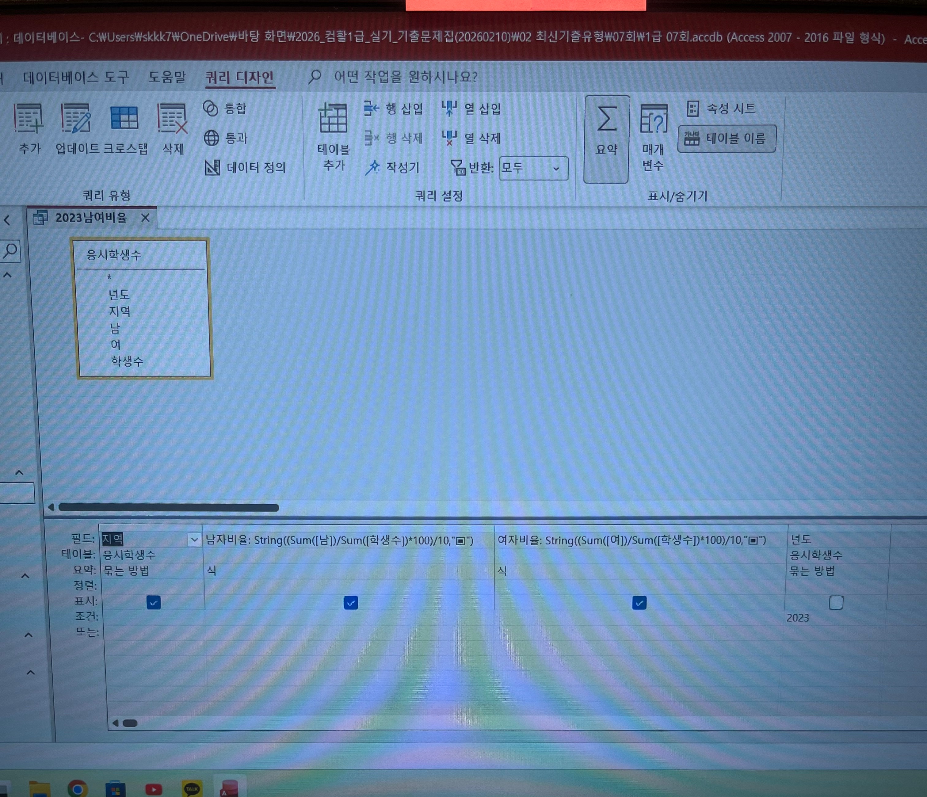 -쿼리 비교 X [2023남여비율] 쿼리 (SELECT 응시학생수.지역, String((Sum([남])/Sum([학생수])*100)/10,"▣") AS 남자비율, String((Sum([여])/Sum([학생수])*100)/10,"▣") AS 여자비율 FROM 응시학생수 GROUP BY 응시학생수.지역, 응시학생수.년도 HAVING (((응시학생수.년도)=2023)); )이 정답(SELECT 응시학생수.지역, String((Sum([남])/Sum([학생수])*100)/10,"▣") AS 남자비율, String((Sum([여])/Sum([학생수])*100)/10,"▣") AS 여자비율 FROM 응시학생수 WHERE (((응시학생수.년도)=2023)) GROUP BY 응시학생수.지역; )과 다릅니다.