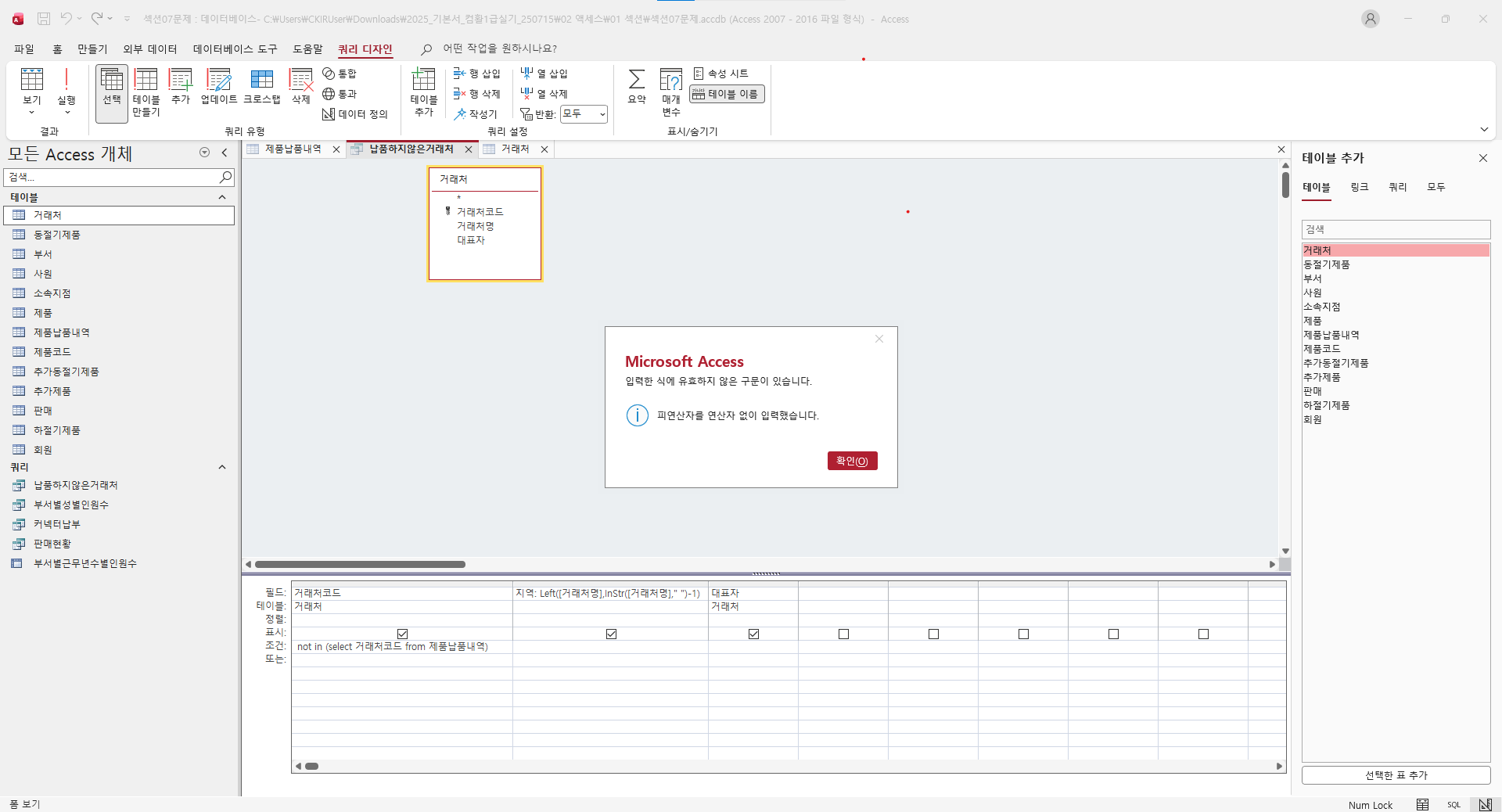 해답처럼 not in (select 거래처코드 from 제품납품내역) 이렇게 썼는데도 빈 결과가 나오네요...