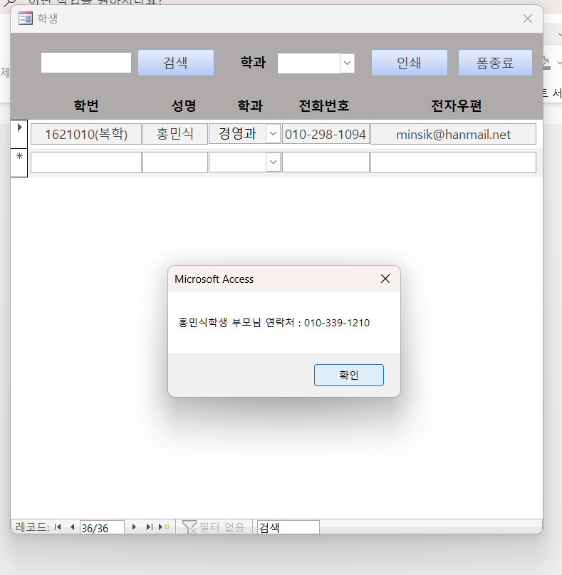 MsgBox DLookup("성명", "학생", "전화번호 = '" & txt전화번호 & "'") & "학생 부모님 연락처 : " & DLookup("보호자연락처", "학생", "전화번호 = '" & txt전화번호 & "'"), vbOKOnly