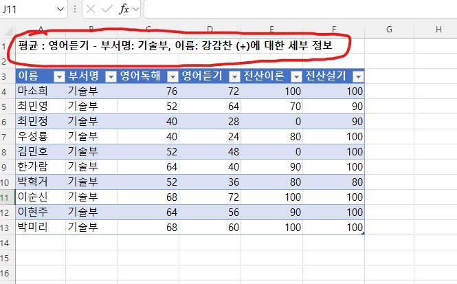 피벗테이블 작성 후 '기술부'인 자료반 별도의 시트에 나타내기 위해 더블클릭 할 경우 답지와 다르게 떠서 온라인 채점시 틀린것으로 나옵니다.