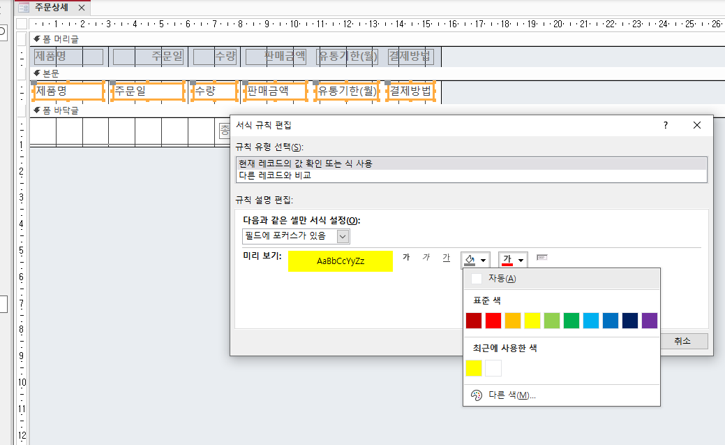 -조건부 서식 배경 색 X 폼 본문 전체 영역 조건부서식의 배경색 값 (Yellow)이 정답(62207)과 다릅니다.