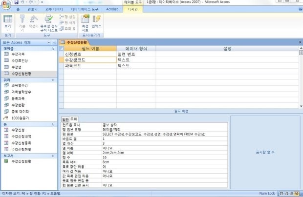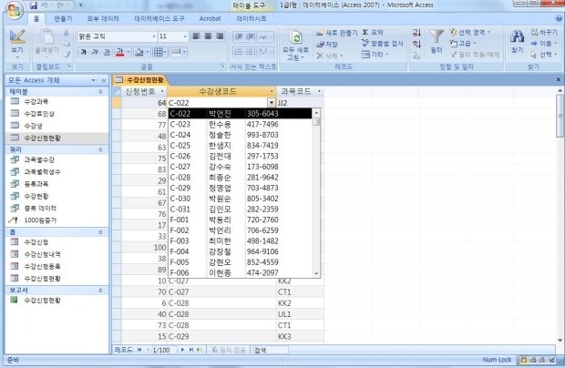 사진에서 보시는것처럼 수강생테이블에서 수강생코드,성명,연락처를 행원본으로 지정했어요.