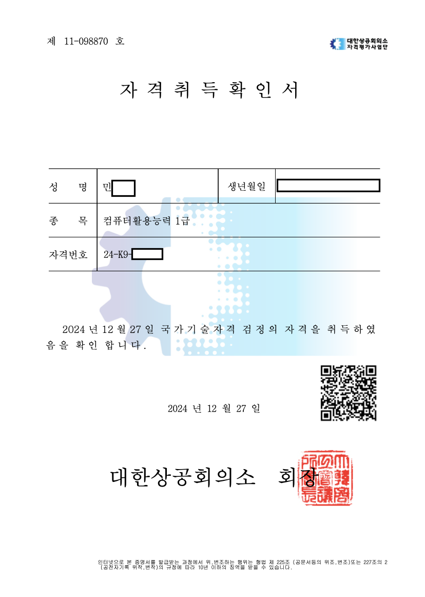 안녕하세요 컴퓨터활용능력 1급 합격 후기를 작성할 수 있어서 너무 기쁩니다!