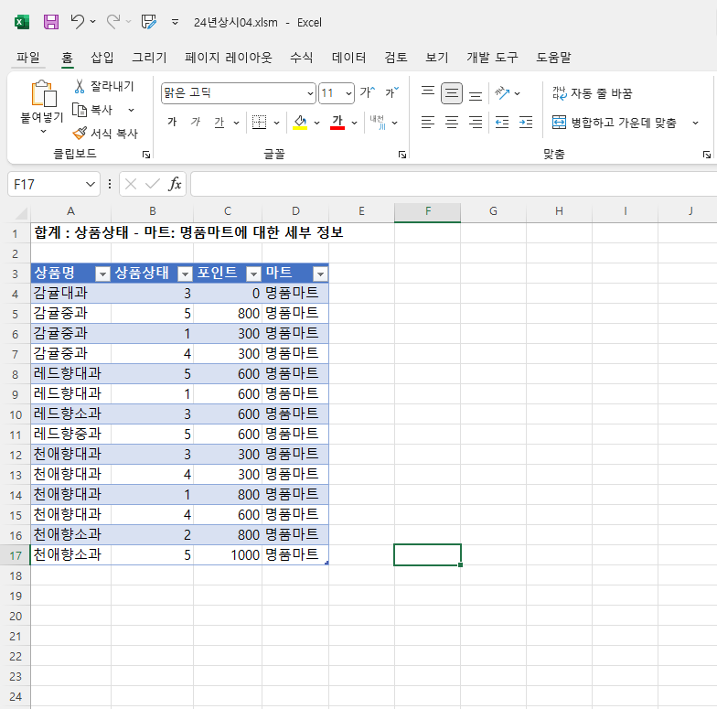 사용하는 프로그램 버전이 달라서 결과가 다르게 실행된 것으로, 실제 시험장에서 실행하면 '합계 : 상품~~" 이 부분은 표시되지 않습니다.