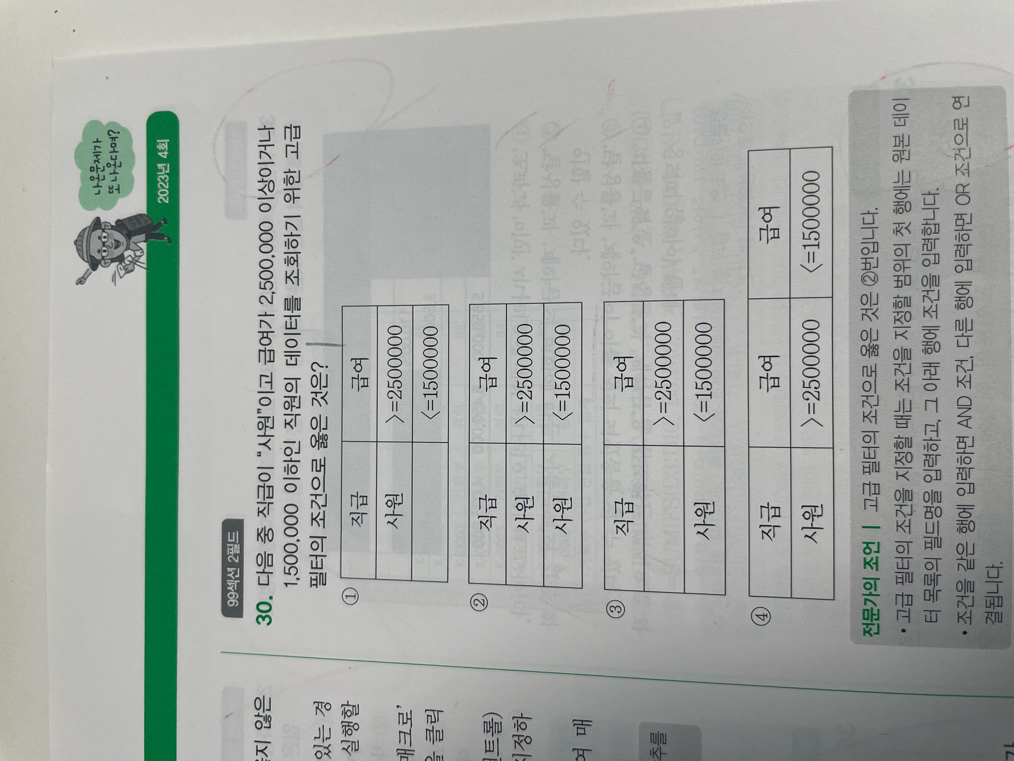 해당 문제에서 직급이 "사원"이고 급여가 2,500,000이상이거나 1,500,000 이하라고 나와있습니다. 직급이 "사원"이고 급여가 2,500,000이상이거나 직급이 "사원"이고 1,500,000 이하라고 문제가 나와있지 않은데 정답이 1번이 아닌 2번인 이유가 궁금합니다.