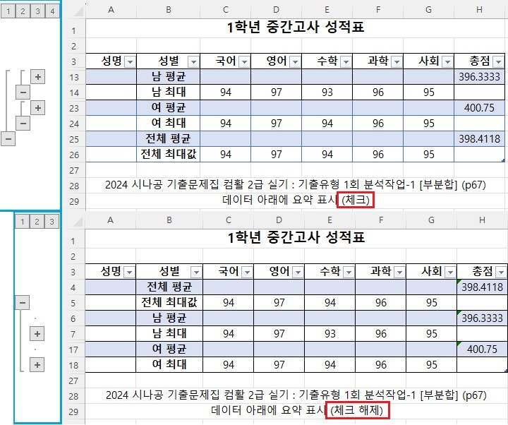 아래 그림처럼 원본 데이터 아래에 부분합의 요약이 표시됐는지를 확인하세요.