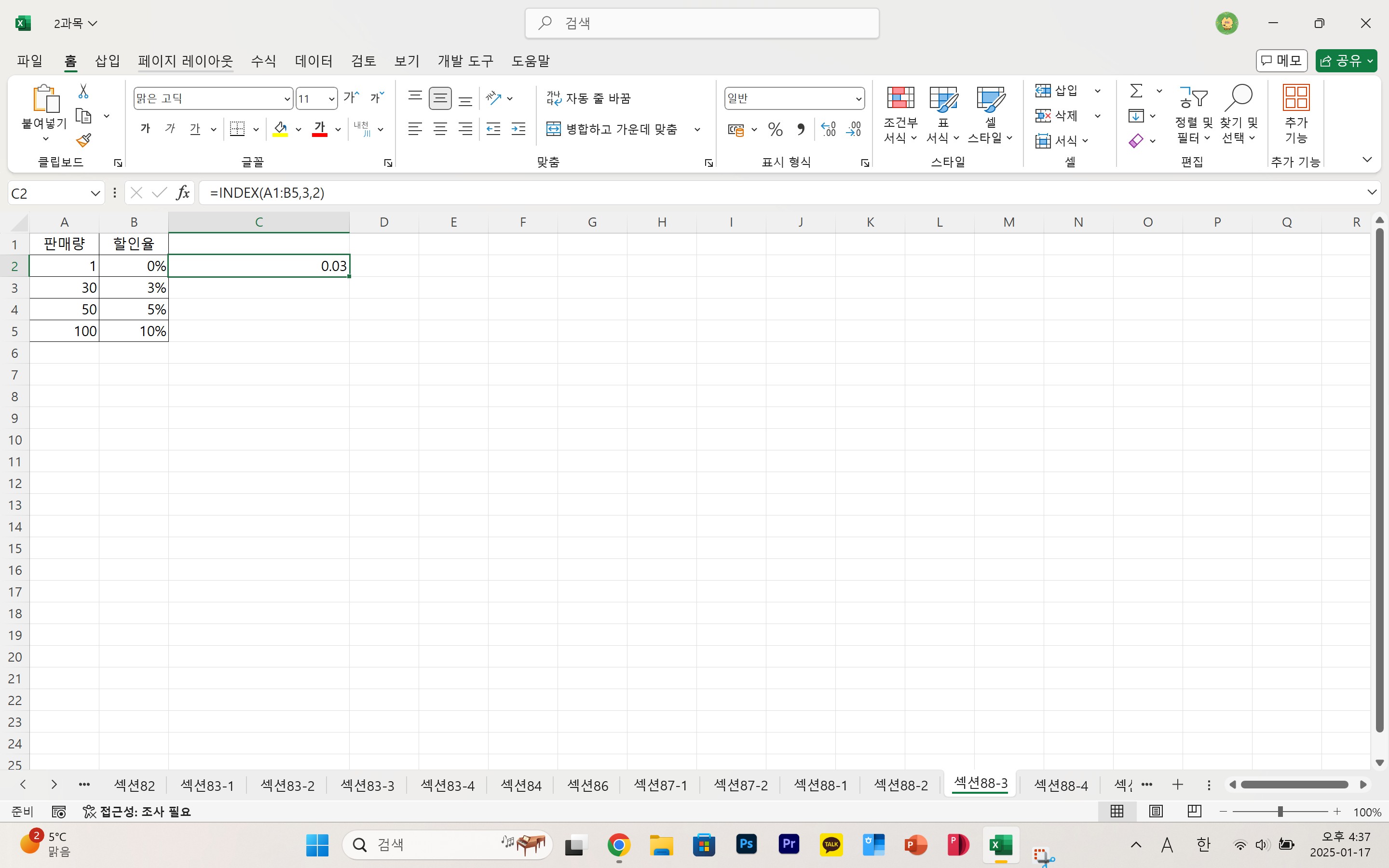 2과목 찾기, 참조 함수 예제를 책보면서 따라하는데 책에서는 =index(a1:b5,3,2)하면 3%가나오는데 제가 책처럼 따라하니 0.03으로 나왔는데 이게 어떻게 된건가요???
