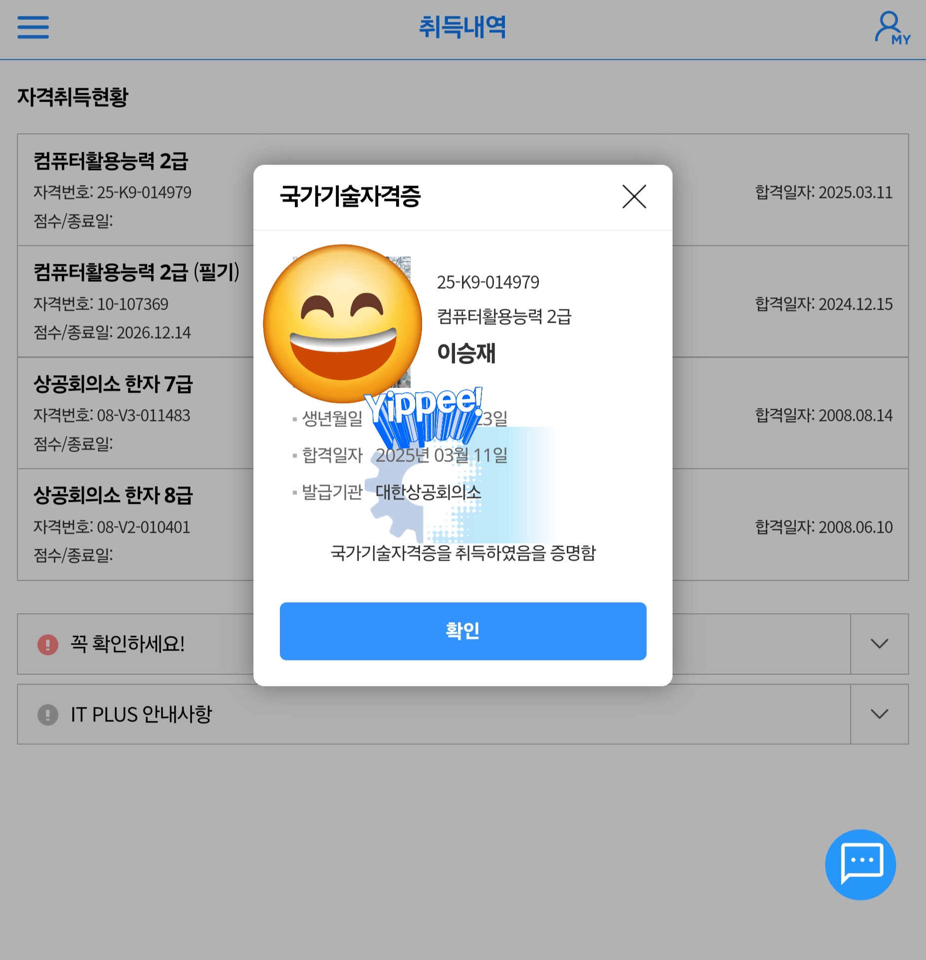 시험 합격했다고 말씀드리니 좋아하셔서 가정 내에서 저의 신뢰도도 올라갔습니다. 방학 때 잘한 일이 컴활 딴겁니다. 여러분들도 꼭 손쉽게 따셨스면 좋겠어요 파이팅!