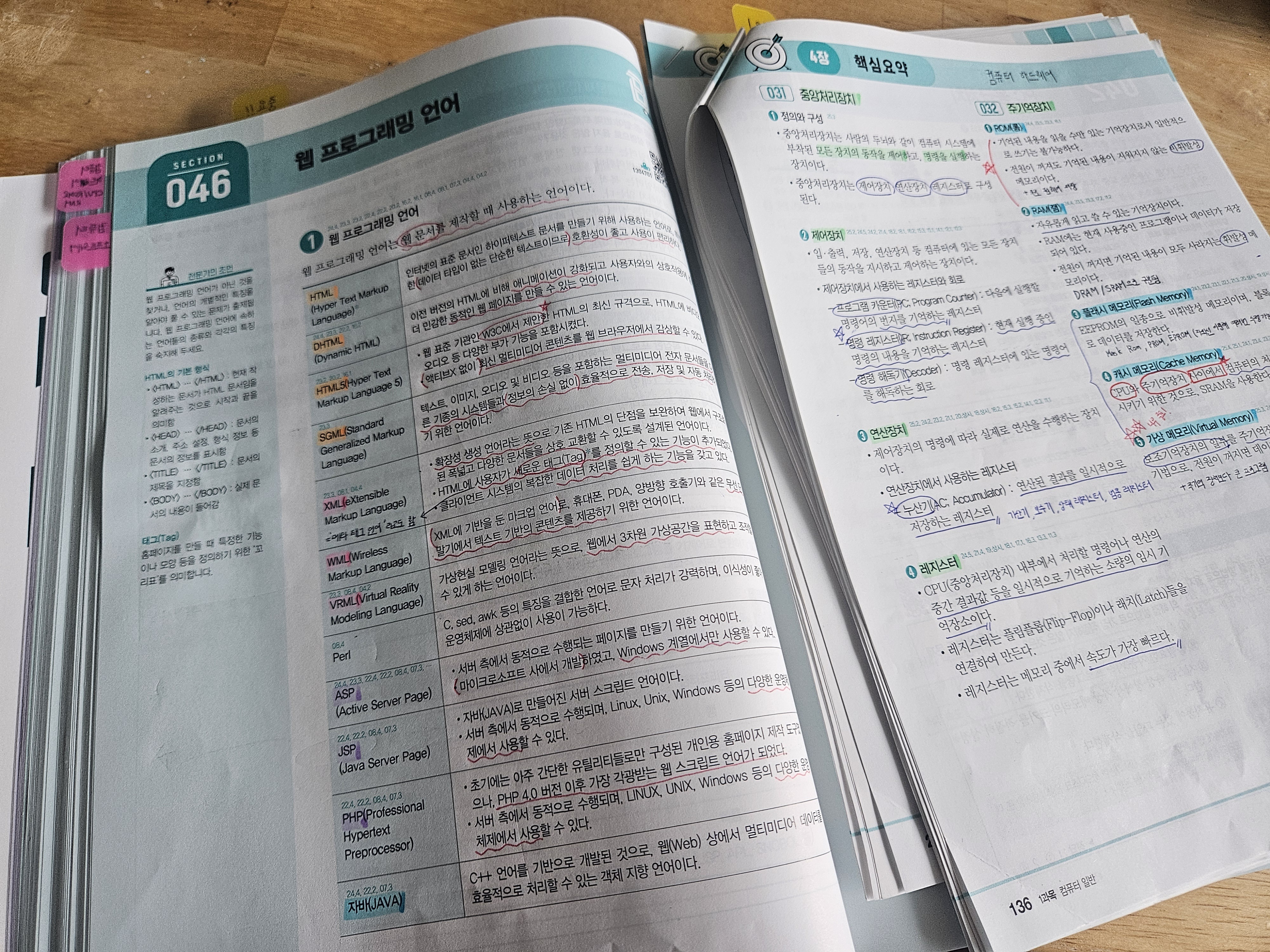 시험장에 가기 전에는 매 단원이 끝날때마다 끝에 있는 핵심요약 페이지들을 잘라 모아서 하나의 책자로 만들어 휘리릭 읽었습니다. 이게 시간이 없을 때 빠르게 훑고 넘어가기 참 좋더군요ㅎ