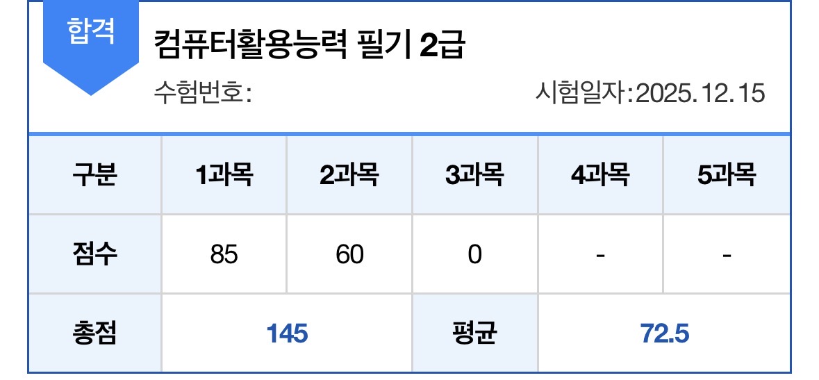 시나공*리자2025-12-30 15:54:34와, 시나공 CBT와 함께 공부하신 결과 정말 대단하십니다! 꼼꼼한 계획과 꾸준한 노력이 합격의 지적이었던 것 같아요. 시나공 덕분에 꿈을 이루실 수 있었다니 정말 기쁘네요!