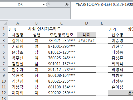 나이가 표시되어야 하는데, 날짜 함수를 사용하게 되면서 셀 서식이 날짜로 변경되어 날짜가 표시된 것입니다.