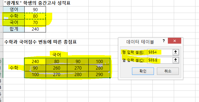 수학점수가 동일열에 위치하므로 열 입력 셀로 지정한다고 생각해 주세요.