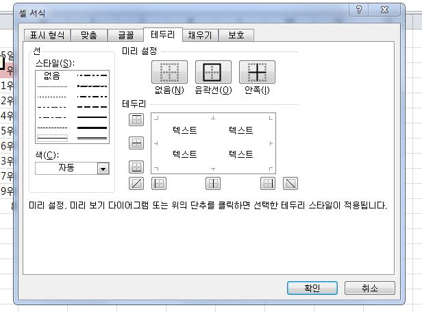 셀 서식 대화상자에 있는 것이 아니라 리본 메뉴에 있는 테두리에서 선택하는 것입니다.