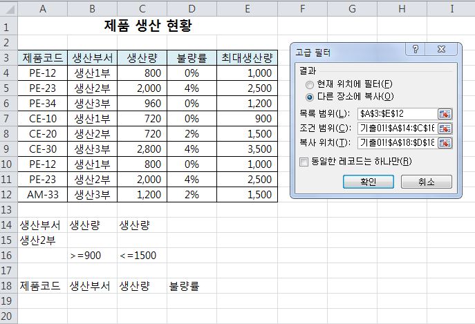 조건 범위, 복사 위치를 드래그를 하면 앞에 "기출01이" 따라 나오는데 결과가 같다면 문제없나요?