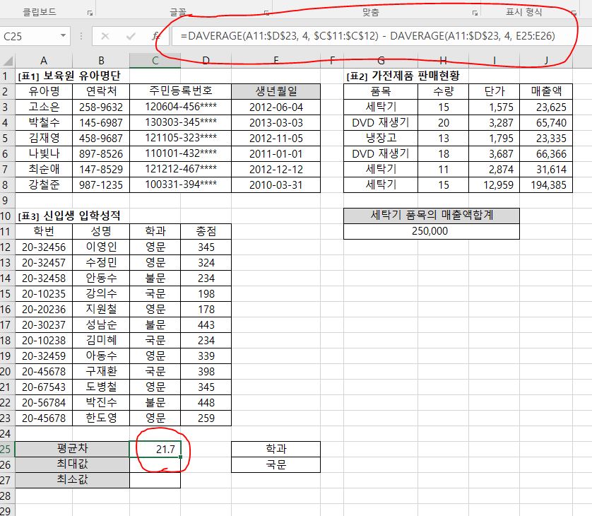 이 문제의 경우 DAVERAGE 함수의 결과값이 양수이므로 ABS를 사용하지 않아도 결과는 동일합니다. 하지만 문제에서 평균차[C25]는 항상 양수로 표시하라는 지시사항이 있고 ABS 함수도 사용하라고 되어 있으므로 반드시 ABS 함수를 사용해서 수식을 작성해야 합니다.