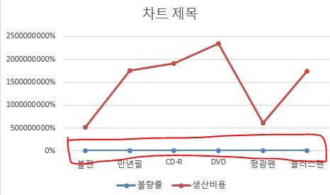 세로 막대형으로 차트를 작성한 다음 '생산비용' 계열만 '꺾은선형' 차트로 변경해야 하는데, 님은 '불량률'과 '생산비용'을 모두를 꺾은 선형으로 변경하셨습니다. 특정 데이터 계열 하나만 다른 차트로 변경하려면 반드시 해당 계열만을 선택한 상태에서 차트 종류를 변경해야 합니다. 처음부터 다시 교재에 나와있는대로 정확히 다시 따라해 보시기 바랍니다.