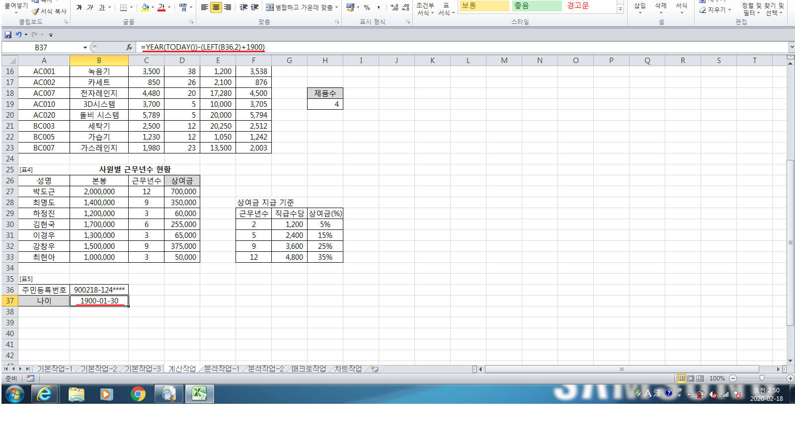 수식에 날짜 함수가 있어 해당 셀의 셀 서식이 날짜 형식으로 변경이 됐네요. 셀 서식 대화상자에서 '일반' 형식으로 변경해 주세요.