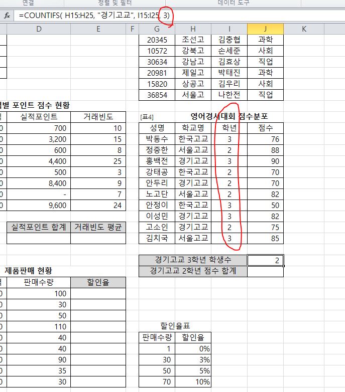 =COUNTIFS(H5:H25, "경기고교", I15:I25, 3)