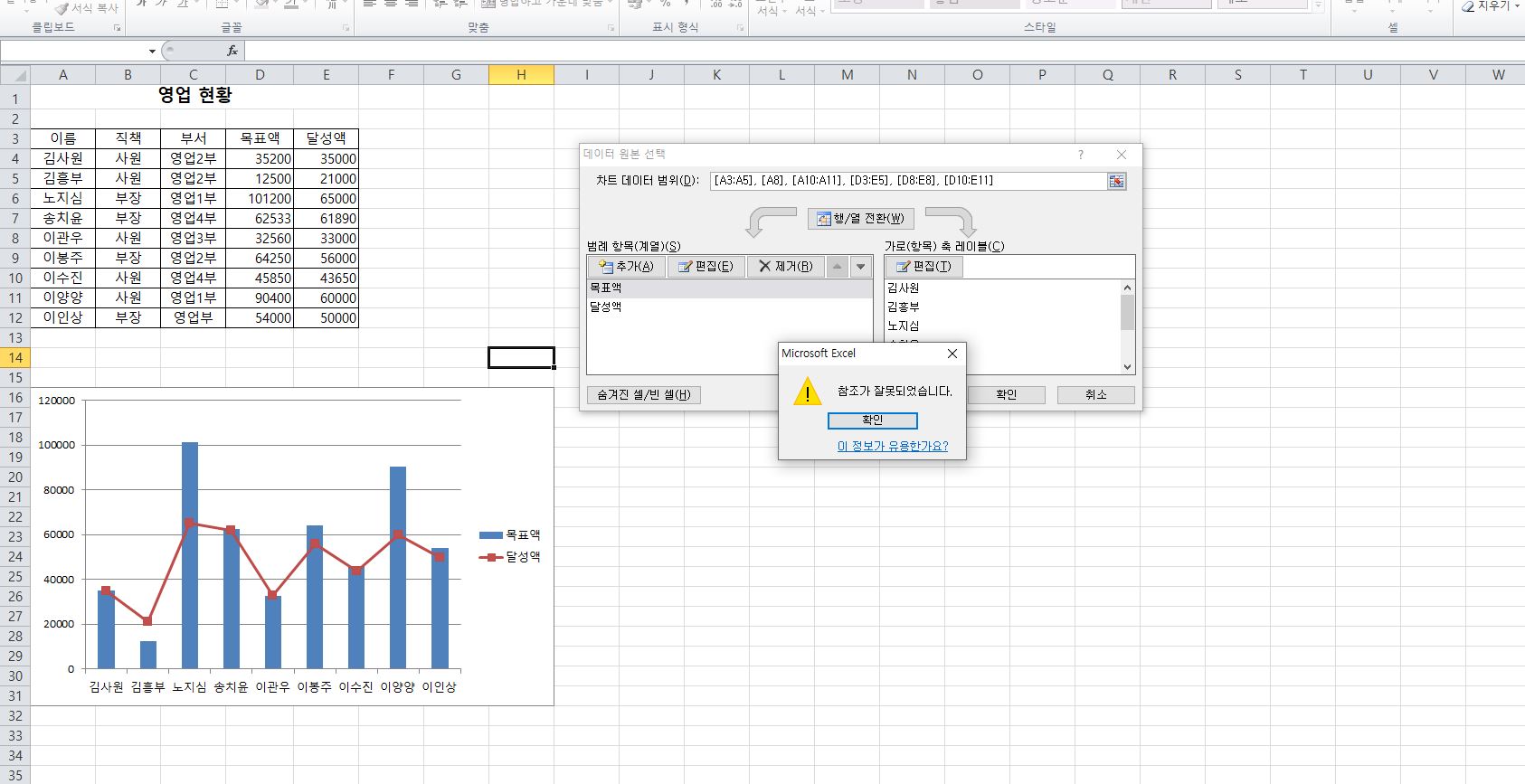 입력창에 데이터 범위에 사진과 같이 입력하고 확인을 누르면 참조가 잘못되었다고 나옵니다.