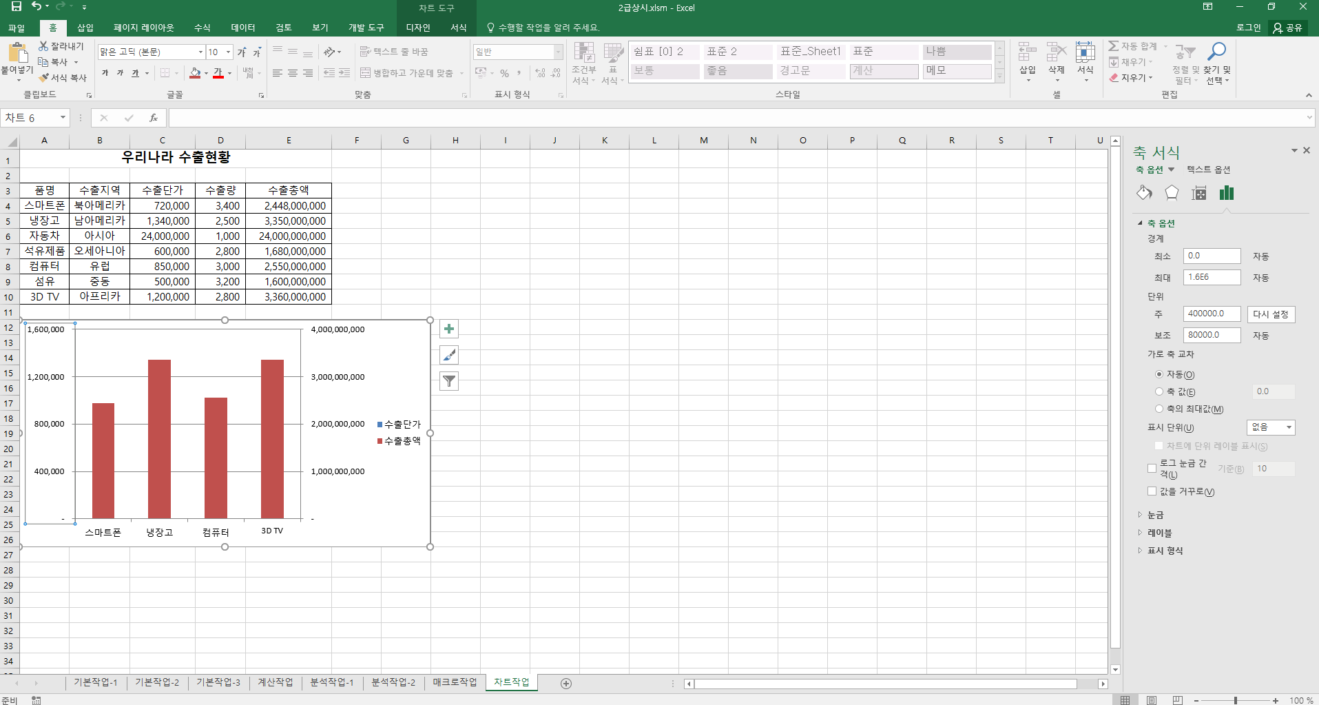 차트작업시 해설집 지시대로만 했는데 파란색인 수출단가 그래프가 나타나질 않습니다. 세로 축, 보조 축 까지 모두 작업했구요. 현재 사용중인 버전이 엑셀2016인데, 버전 차이 일까요?