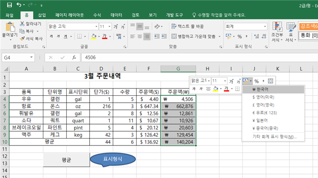 "표시형식"을 지정하는 매크로 2번 문제에서 '회계 표시 형식'을 바로 지정하는 것과 사진과 같이 '\ 한국어'로 지정하는 것의 차이점이 무엇인가요?