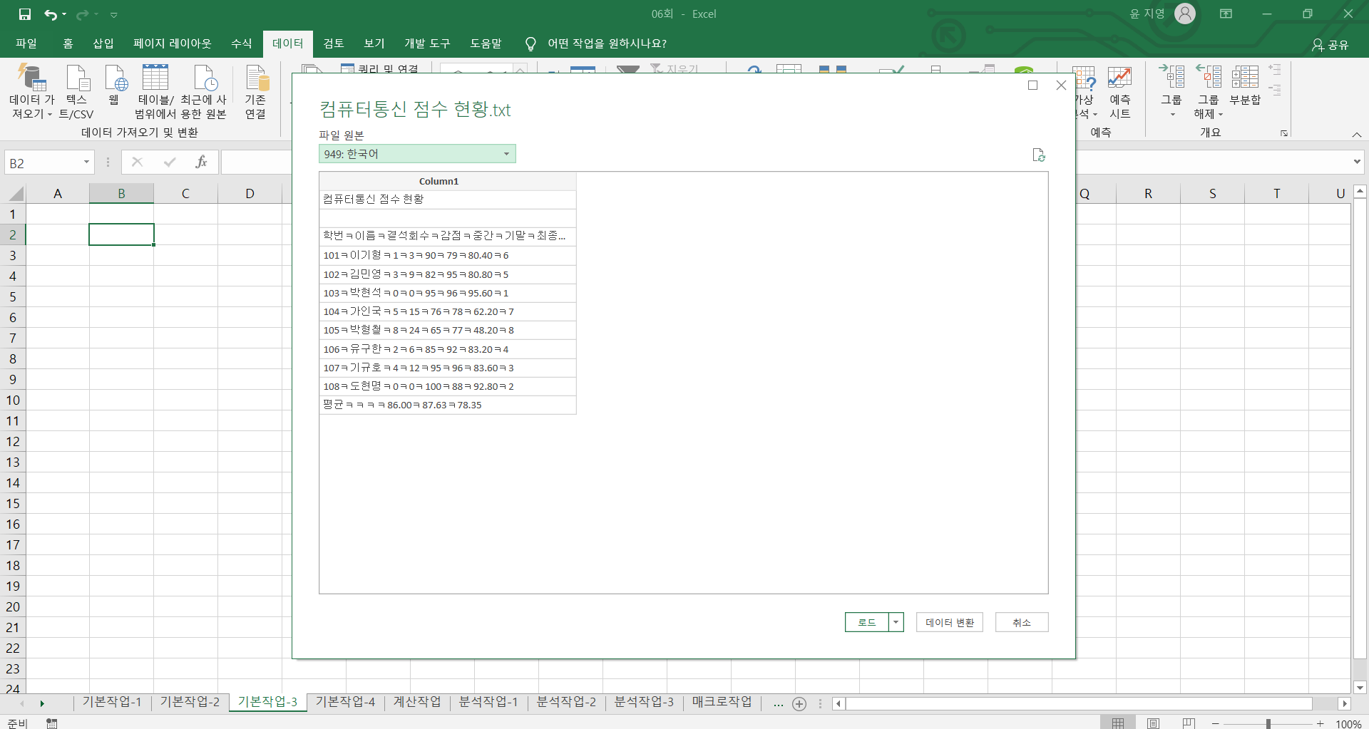 Excel 2019를 쓰는데 텍스트 가져오기를 할 때, 사진 첨부한 것처럼 나오고 교재에 있는대로 나오지 않아서