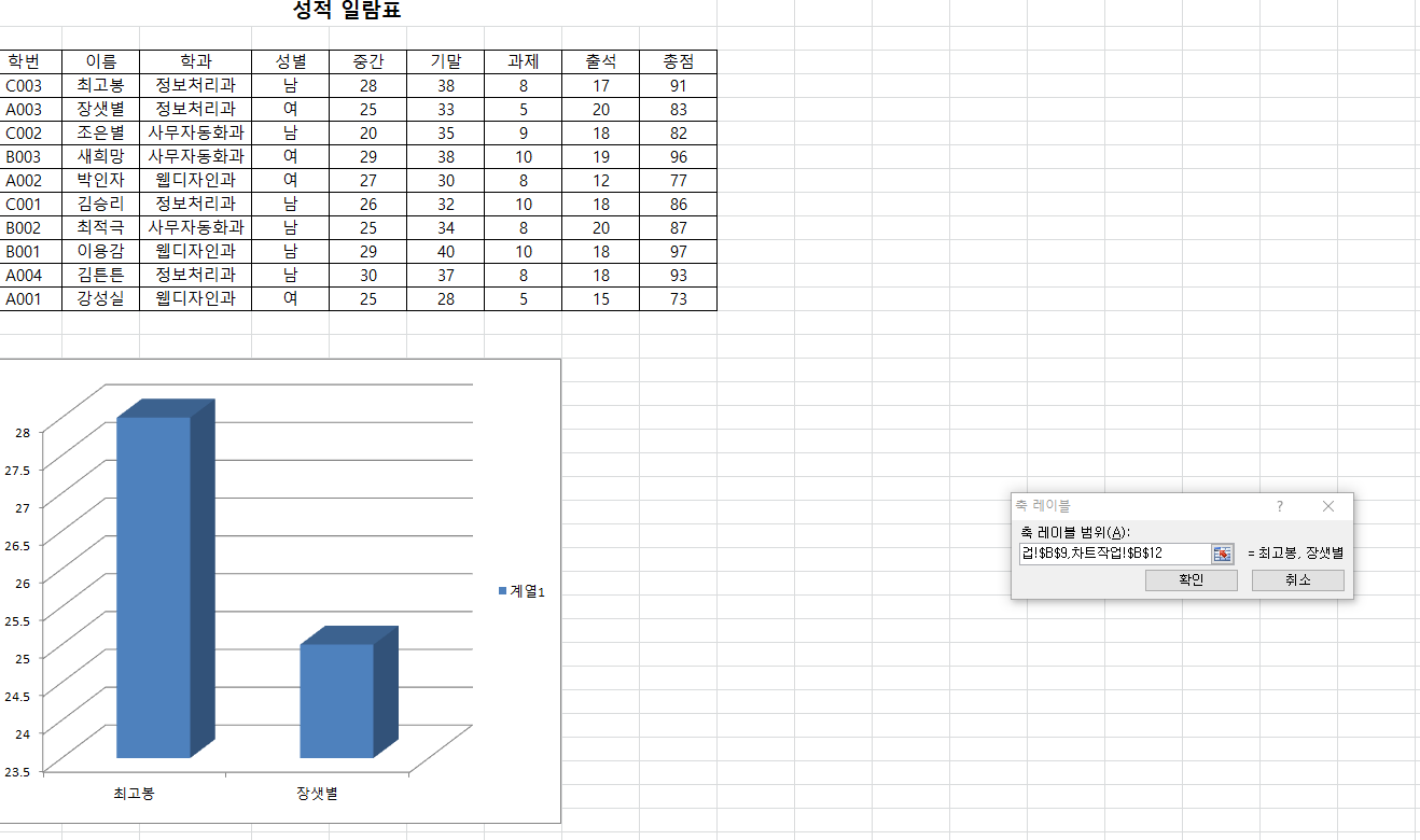 최고봉,장샛별에 해당하는 데이터만 범례항목 계열값에 입력이 되고 축 레이블 범위도 마찬가지네요 ㅠㅠ