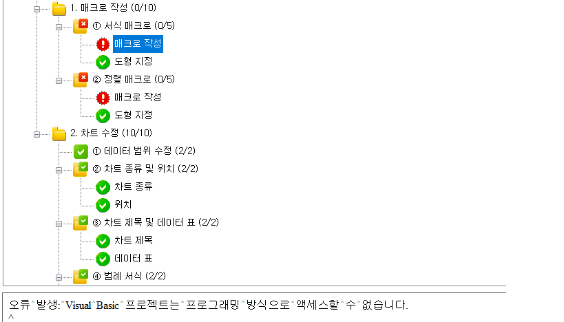 채점 프로그램이 매크로를 실행했을때 오류가 발생한듯 합니다. 님이 작성한 파일을 올려주시면 매크로를 정상적으로 작성했는지 직접 확인해 드리도록 하겠습니다. 공부하는데 불편함을 드려 죄송합니다.