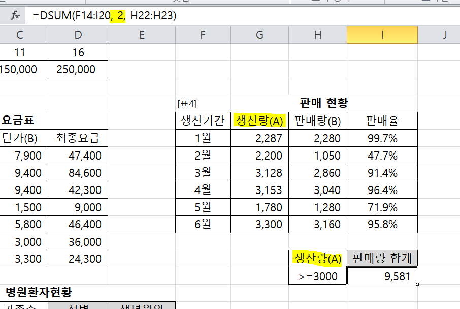 생산량(A)의 조건에 맞는 판매량 합계를 구해주는 문제이면 필드가 2 가 되어야 하는게 아닌 건가요...?