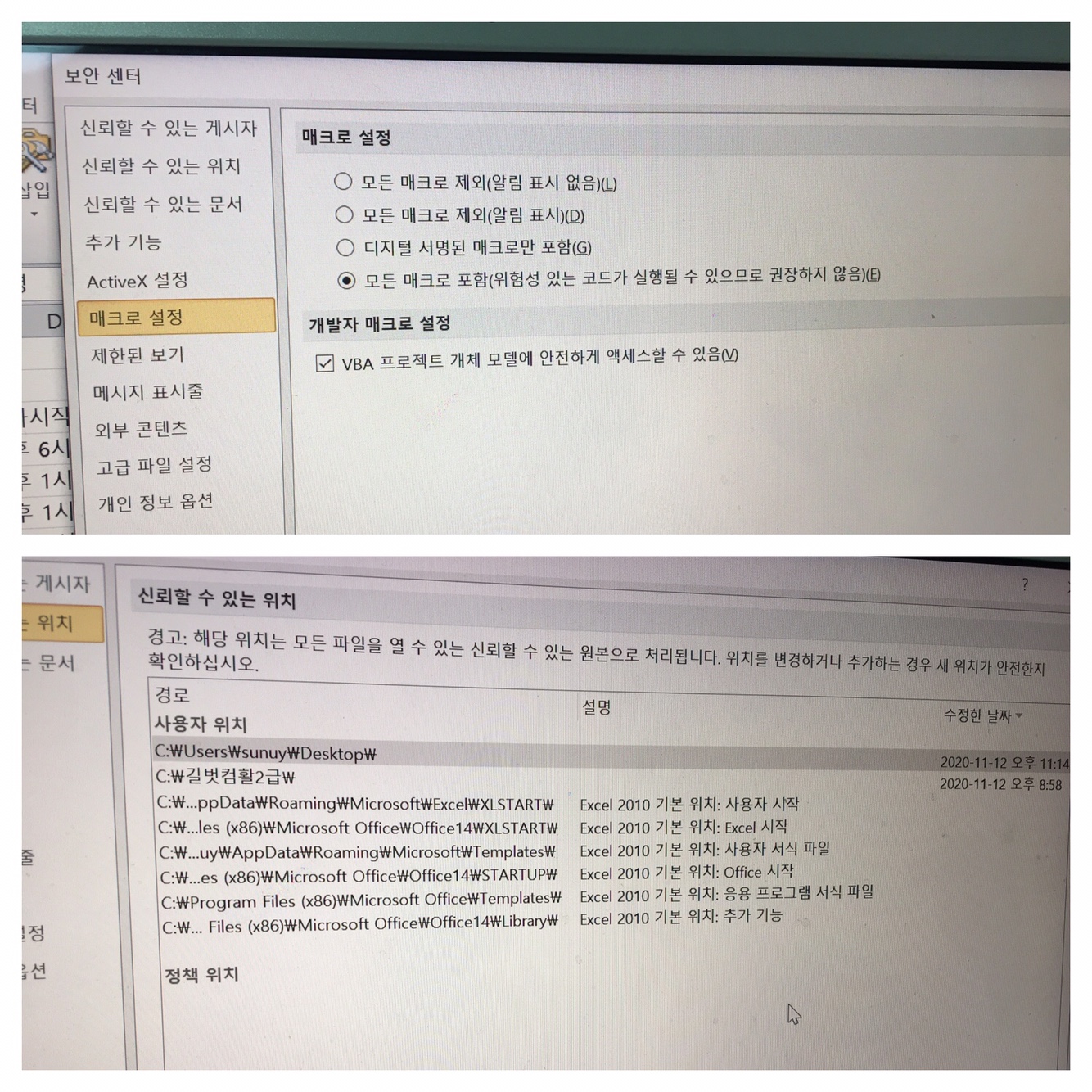 매크로 관련하여 두가지 다 설정 하였는데도 아직도 채점 파일 프로그램을 돌리면